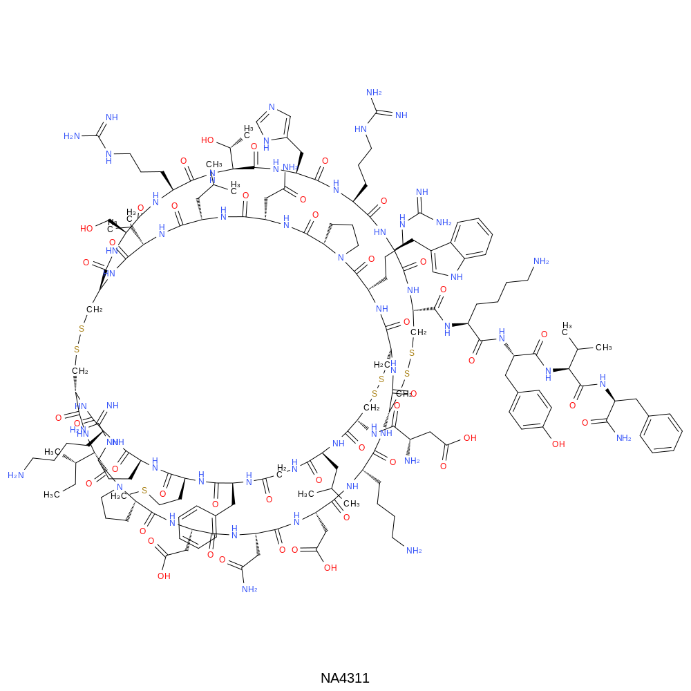 | SMILES | CC[C@H](C)[C@@H]1NC(=O)[C@@H]2CSSC[C@@H]3NC(=O)[C@H](C(C)C)NC(=O)[C@H](CC(C)C)NC(=O)[C@H](CC(N)=O)NC(=O)[C@@H]4CCCN4C(=O)[C@H](CCCNC(=N)N)NC(=O)[C@H](CSSC[C@H](NC(=O)[C@@H](N)CC(=O)O)C(=O)N[C@@H](CC(C)C)C(=O)NCC(=O)N[C@@H](Cc4ccccc4)C(=O)N[C@@H](CCSC)C(=O)N[C@@H](CCCNC(=N)N)C(=O)N[C@@H](CCCCN)C(=O)N2)NC(=O)[C@H](CSSC[C@@H](C(=O)N[C@@H](CCCCN)C(=O)N[C@@H](Cc2ccc(O)cc2)C(=O)N[C@H](C(=O)N[C@@H](Cc2ccccc2)C(N)=O)C(C)C)NC(=O)[C@H](Cc2c[nH]c4ccccc24)NC(=O)[C@H](CCCNC(=N)N)NC(=O)[C@H](Cc2cnc[nH]2)NC(=O)[C@H]([C@@H](C)O)NC(=O)[C@H](CCCNC(=N)N)NC(=O)[C@H](CO)NC3=O)NC(=O)[C@H](CCCCN)NC(=O)[C@H](CC(=O)O)NC(=O)[C@H](CC(N)=O)NC(=O)[C@H](CC(=O)O)NC(=O)[C@@H]2CCCN2C1=O | |
