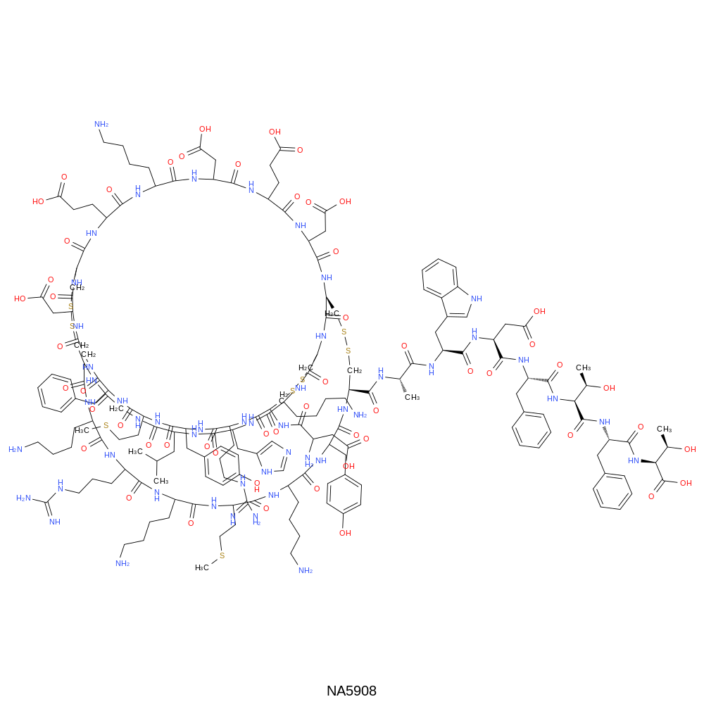 | SMILES | CSCC[C@@H]1NC(=O)[C@H](Cc2ccc(O)cc2)NC(=O)[C@H](CCCNC(=N)N)NC(=O)[C@@H](NC(=O)[C@@H](N)CC(=O)O)CSSC[C@@H]2NC(=O)[C@@H]3CSSC[C@@H](C(=O)N[C@@H](C)C(=O)N[C@@H](Cc4c[nH]c5ccccc45)C(=O)N[C@@H](CC(=O)O)C(=O)N[C@@H](Cc4ccccc4)C(=O)N[C@H](C(=O)N[C@@H](Cc4ccccc4)C(=O)N[C@H](C(=O)O)[C@@H](C)O)[C@@H](C)O)NC(=O)[C@H](Cc4ccc(O)cc4)NC(=O)[C@H](CCCCN)NC(=O)[C@H](CCSC)NC(=O)[C@H](CCCCN)NC(=O)[C@H](CCCNC(=N)N)NC(=O)[C@H](CCCCN)NC(=O)[C@H](CSSC[C@H](NC(=O)[C@H](CC(=O)O)NC(=O)CNC(=O)[C@H](Cc4ccccc4)NC1=O)C(=O)N[C@@H](CCC(=O)O)C(=O)N[C@@H](CCCCN)C(=O)N[C@@H](CC(=O)O)C(=O)N[C@@H](CCC(=O)O)C(=O)N[C@@H](CC(=O)O)C(=O)N3)NC(=O)CNC(=O)[C@H](CC(C)C)NC(=O)[C@H](Cc1cnc[nH]1)NC(=O)[C@H](CCCCN)NC2=O | |