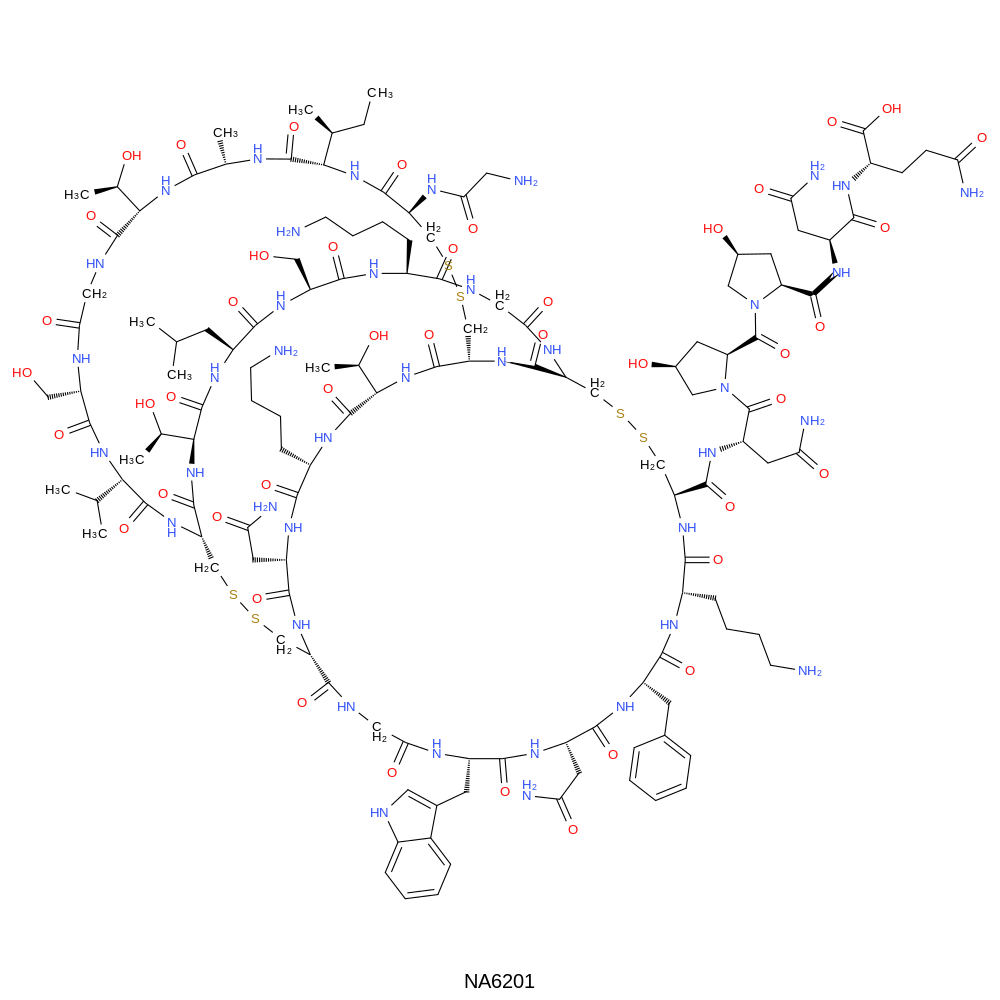 | SMILES | CC[C@H](C)[C@@H]1NC(=O)[C@@H](NC(=O)CN)CSSC[C@@H]2NC(=O)[C@@H]3CSSC[C@@H](C(=O)N[C@@H](CC(N)=O)C(=O)N4C[C@@H](O)C[C@H]4C(=O)N4C[C@@H](O)C[C@H]4C(=O)N[C@@H](CC(N)=O)C(=O)N[C@@H](CCC(N)=O)C(=O)O)NC(=O)[C@H](CCCCN)NC(=O)[C@H](Cc4ccccc4)NC(=O)[C@H](CC(N)=O)NC(=O)[C@H](Cc4c[nH]c5ccccc45)NC(=O)CNC(=O)[C@H](CSSC[C@H](NC(=O)[C@H](C(C)C)NC(=O)[C@H](CO)NC(=O)CNC(=O)[C@H]([C@@H](C)O)NC(=O)[C@H](C)NC1=O)C(=O)N[C@@H]([C@@H](C)O)C(=O)N[C@@H](CC(C)C)C(=O)N[C@@H](CO)C(=O)N[C@@H](CCCCN)C(=O)NCC(=O)N3)NC(=O)[C@H](CC(N)=O)NC(=O)[C@H](CCCCN)NC(=O)[C@H]([C@@H](C)O)NC2=O | |