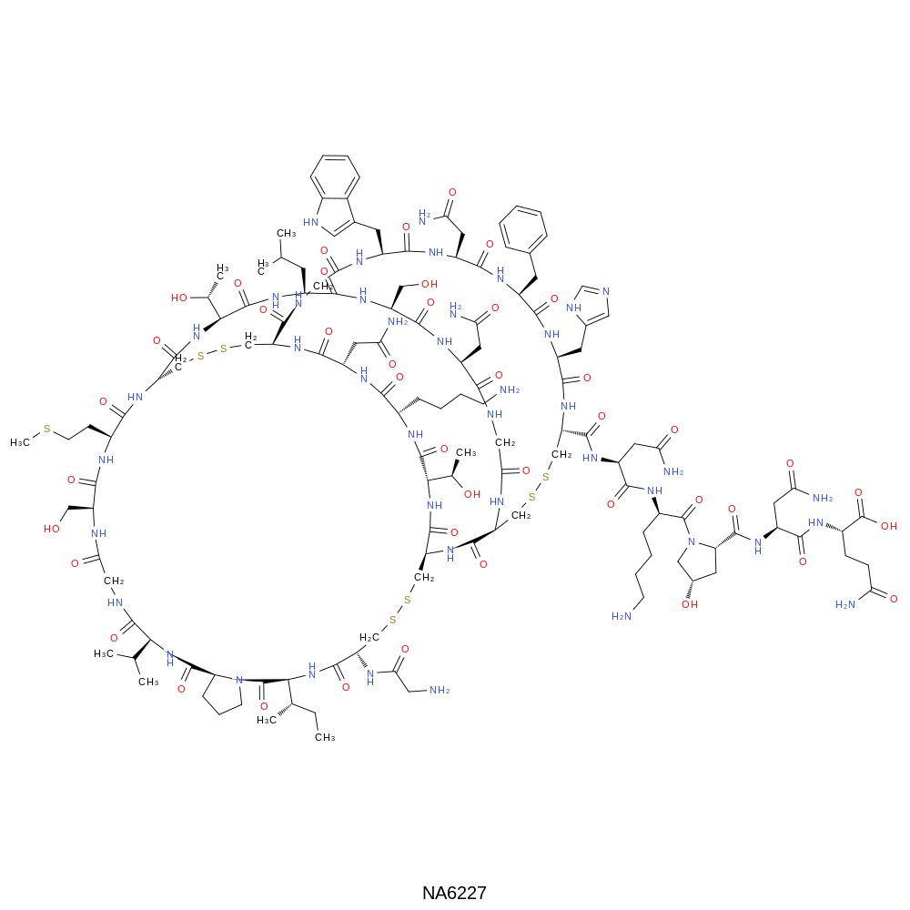 | SMILES | CC[C@H](C)[C@@H]1NC(=O)[C@@H](NC(=O)CN)CSSC[C@@H]2NC(=O)[C@@H]3CSSC[C@@H](C(=O)N[C@@H](CC(N)=O)C(=O)N[C@H](CCCCN)C(=O)N4C[C@@H](O)C[C@H]4C(=O)N[C@@H](CC(N)=O)C(=O)N[C@@H](CCC(N)=O)C(=O)O)NC(=O)[C@H](Cc4cnc[nH]4)NC(=O)[C@H](Cc4ccccc4)NC(=O)[C@H](CC(N)=O)NC(=O)[C@H](Cc4c[nH]c5ccccc45)NC(=O)CNC(=O)[C@H](CSSC[C@H](NC(=O)[C@H](CCSC)NC(=O)[C@H](CO)NC(=O)CNC(=O)[C@H](C(C)C)NC(=O)[C@@H]4CCCN4C1=O)C(=O)N[C@@H]([C@@H](C)O)C(=O)N[C@@H](CC(C)C)C(=O)N[C@@H](CO)C(=O)N[C@@H](CC(N)=O)C(=O)NCC(=O)N3)NC(=O)[C@H](CC(N)=O)NC(=O)[C@H](CCCCN)NC(=O)[C@H]([C@@H](C)O)NC2=O | |