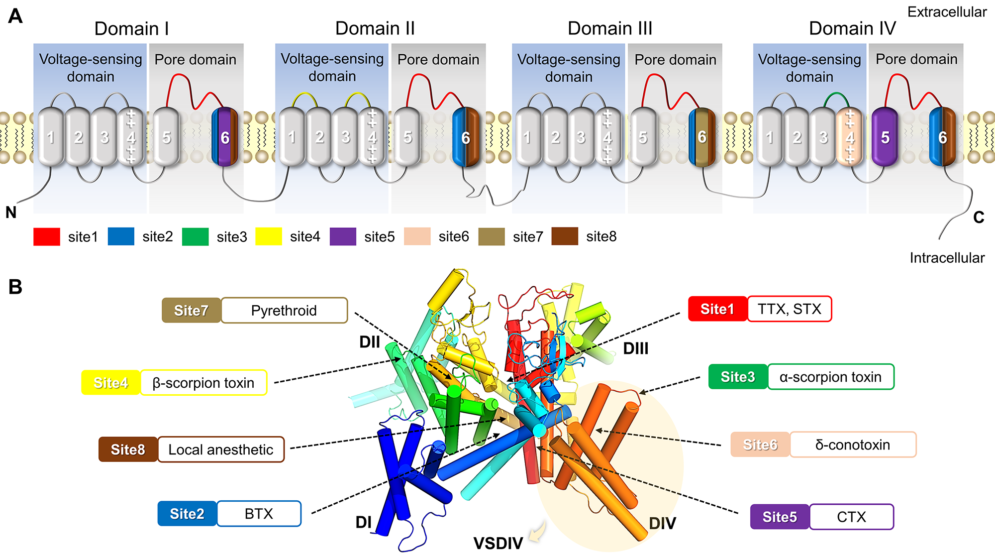| 8 | Small-molecule drugs, local anesthetics (LA) | LA binding site | Near DI~DIV S6 |