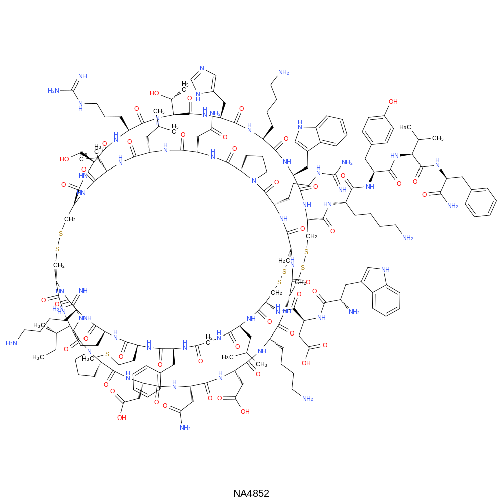 | InChI | InChI=1S/C187H281N55O46S7/c1-13-98(10)149-184(288)242-67-36-53-140(242)179(283)228-131(81-146(253)254)167(271)225-127(77-141(193)246)164(268)226-130(80-145(251)252)166(270)214-115(48-27-31-62-191)158(262)231-136-90-293-290-87-133(172(276)216-113(46-25-29-60-189)155(259)223-124(73-102-54-56-106(245)57-55-102)170(274)238-147(96(6)7)180(284)219-120(151(195)255)71-100-37-16-14-17-38-100)233-162(266)125(75-104-83-207-111-44-23-21-42-108(104)111)224-156(260)112(45-24-28-59-188)213-163(267)126(76-105-84-202-93-209-105)229-182(286)150(99(11)244)240-160(264)117(50-33-64-204-186(198)199)215-171(275)132(86-243)230-175(279)137-91-294-295-92-138(177(281)239-149)232-157(261)114(47-26-30-61-190)211-154(258)116(49-32-63-203-185(196)197)212-159(263)118(58-68-289-12)217-161(265)123(72-101-39-18-15-19-40-101)210-143(248)85-208-153(257)121(69-94(2)3)221-174(278)135(234-168(272)129(79-144(249)250)220-152(256)109(192)74-103-82-206-110-43-22-20-41-107(103)110)89-292-291-88-134(235-176(136)280)173(277)218-119(51-34-65-205-187(200)201)183(287)241-66-35-52-139(241)178(282)227-128(78-142(194)247)165(269)222-122(70-95(4)5)169(273)237-148(97(8)9)181(285)236-137/h14-23,37-44,54-57,82-84,93-99,109,112-140,147-150,206-207,243-245H,13,24-36,45-53,58-81,85-92,188-192H2,1-12H3,(H2,193,246)(H2,194,247)(H2,195,255)(H,202,209)(H,208,257)(H,210,248)(H,211,258)(H,212,263)(H,213,267)(H,214,270)(H,215,275)(H,216,276)(H,217,265)(H,218,277)(H,219,284)(H,220,256)(H,221,278)(H,222,269)(H,223,259)(H,224,260)(H,225,271)(H,226,268)(H,227,282)(H,228,283)(H,229,286)(H,230,279)(H,231,262)(H,232,261)(H,233,266)(H,234,272)(H,235,280)(H,236,285)(H,237,273)(H,238,274)(H,239,281)(H,240,264)(H,249,250)(H,251,252)(H,253,254)(H4,196,197,203)(H4,198,199,204)(H4,200,201,205)/t98-,99+,109-,112-,113-,114-,115-,116-,117-,118-,119-,120-,121-,122-,123-,124-,125-,126-,127-,128-,129-,130-,131-,132-,133-,134-,135-,136-,137-,138-,139-,140-,147-,148-,149-,150-/m0/s1 | |